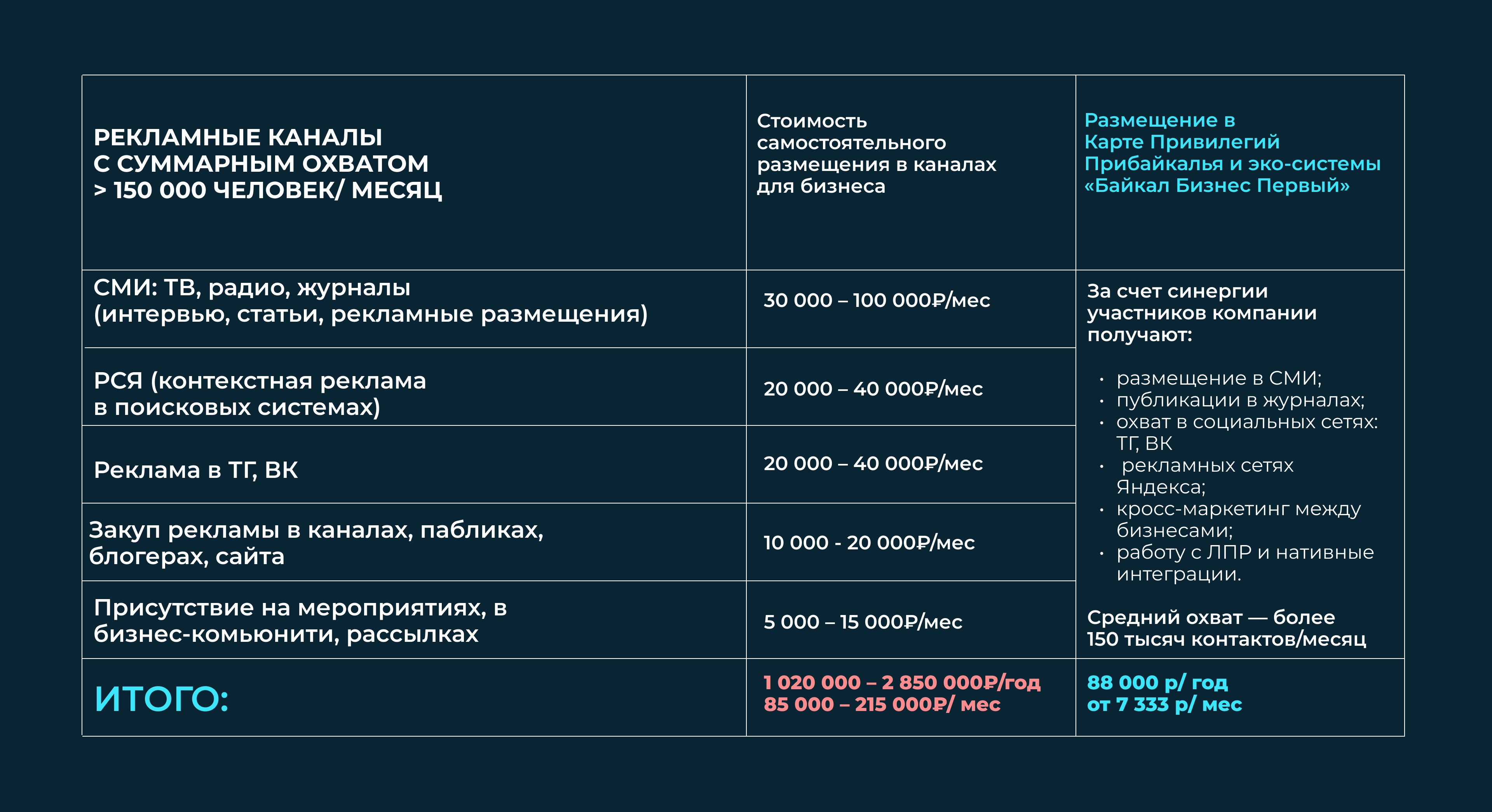 Очевидный вопрос: возможно ли за эти деньги самостоятельно разместиться во всех перечисленных каналах? Ответ очевиден — нет. Именно за счёт объединения бюджетов и совместного инфоповода достигается такой эффект для участников эко-системы «Байкал Бизнес Первый» и «Карты Привилегий Прибайкалья».