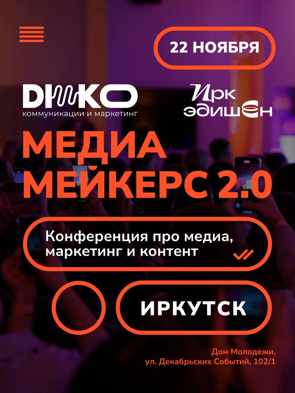 22 НОЯБРЯ 2025 пройдёт вторая большая конференция от городского медиа-портала «Иркэдишен» и Diko Studio - МедиаМейкерс 2.0